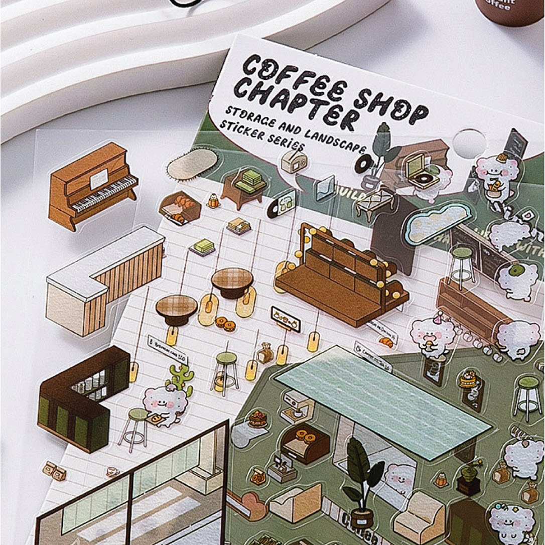 💝 แต่ละเซ็ทประกอบด้วยสติกเกอร์ 2 แผ่น ฉากหลัง 1 แผ่น อัดแน่นด้วยสติกเกอร์กว่า 40 ชิ้น ทั้งเฟอร์นิเจอร์ โคมไฟระย้า ต้นไม้ประดับ และของแต่งร้านสุดคิวท์ ให้คุณสนุกกับการแต่งร้านในฝัน!